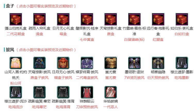 单盒成衣:[棉袄盒衣, 雪月盒衣, 粉凤舞衣, 唐风韶颜衣, 粉游园衣, 黑明光衣, 红雪人衣, 二代花朝衣]