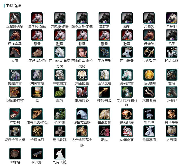 【坐骑】4个[踏炎不羁, 西风瘦逐狱, 里飞沙踏秋, 乌鬃踏焰驹]