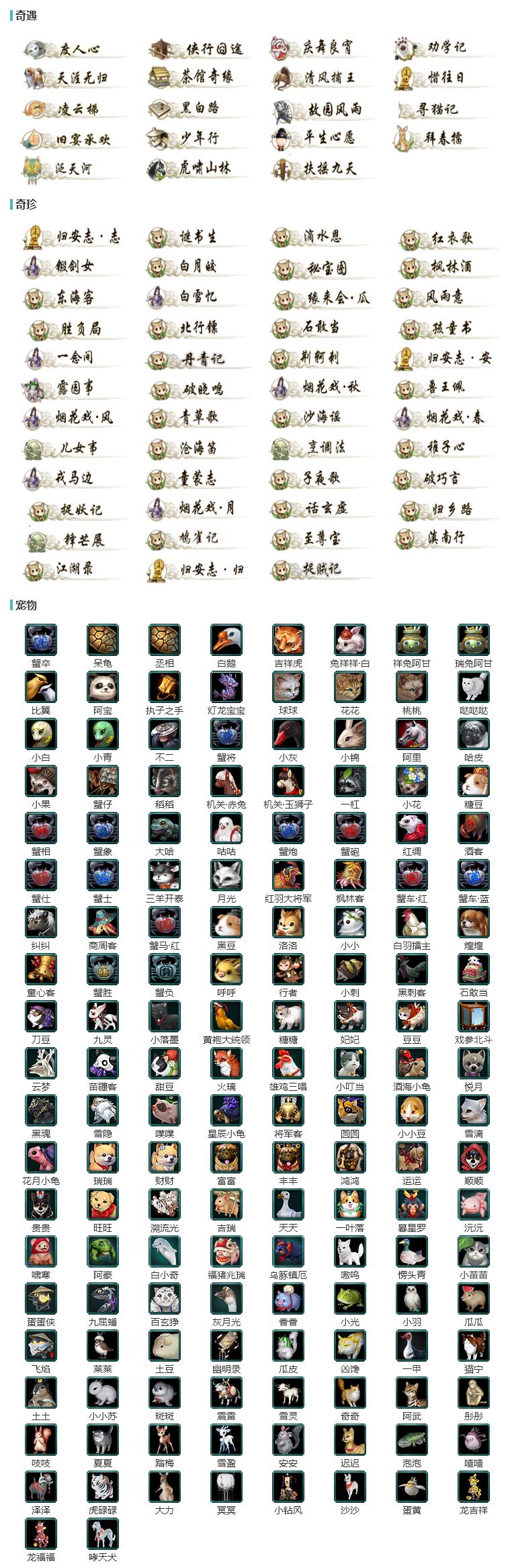 【奇遇】18个[天涯无归, 劝学记, 黑白路, 平生心愿, 惜往日, 虎啸山林, 少年行, 扶摇九天, 故园风雨, 清风捕王, 侠行囧途, 茶馆奇缘, 寻猫记, 庆舞良宵, 凌云梯, 度人心, 旧宴承欢, 拜春擂]