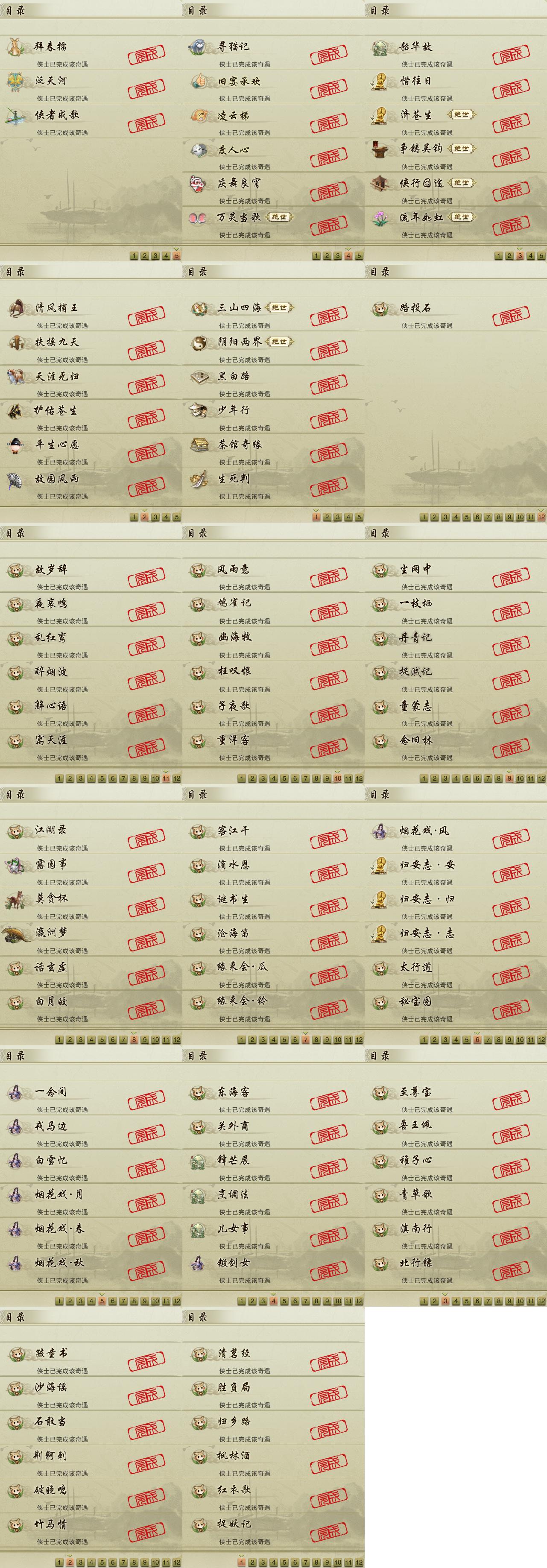【奇遇】27个[天涯无归, 三山四海, 阴阳两界, 平生心愿, 黑白路, 惜往日, 韶华故, 争铸吴钩, 济苍生, 护佑苍生, 少年行, 扶摇九天, 故园风雨, 流年如虹, 清风捕王, 寻猫记, 侠行囧途, 茶馆奇缘, 庆舞良宵, 万灵当歌, 生死判, 凌云梯, 度人心, 旧宴承欢, 泛天河, 侠者成歌, 拜春擂]
