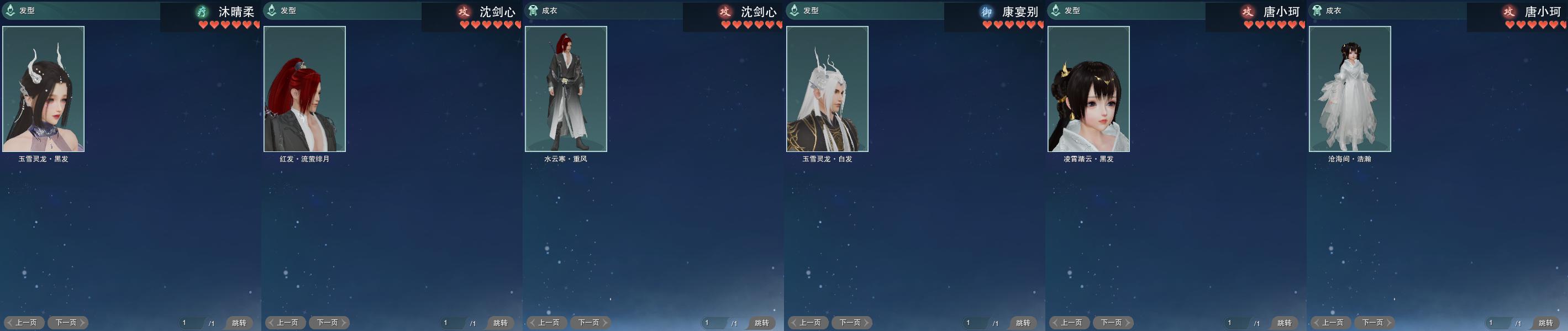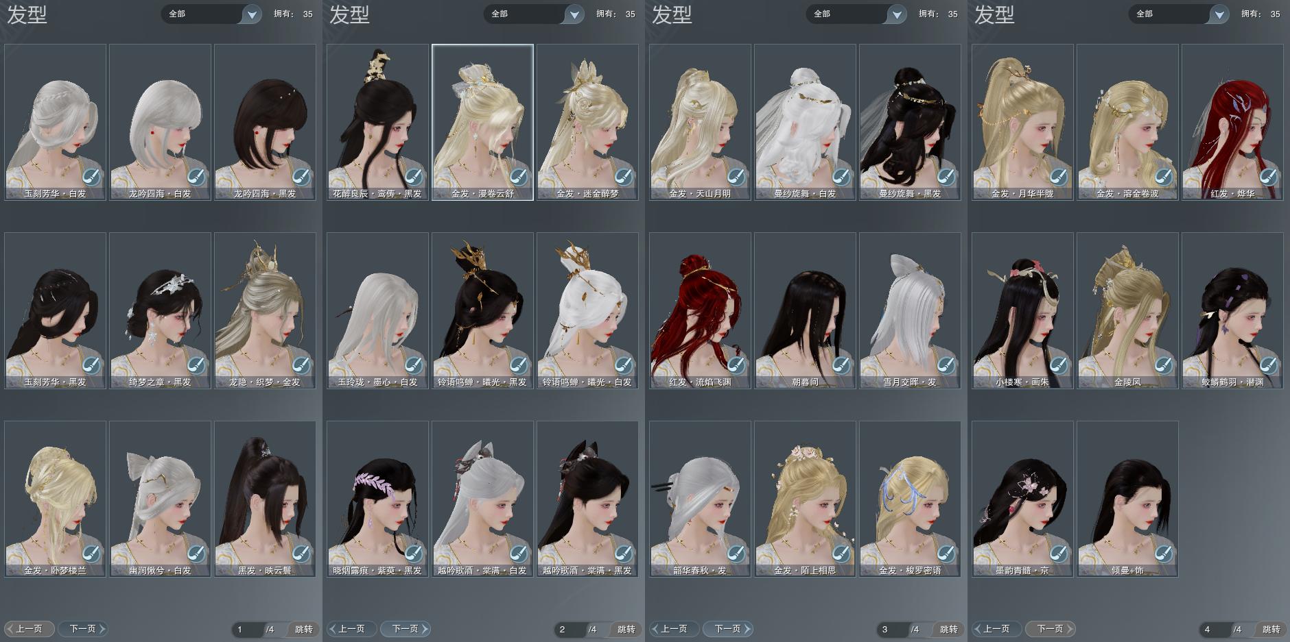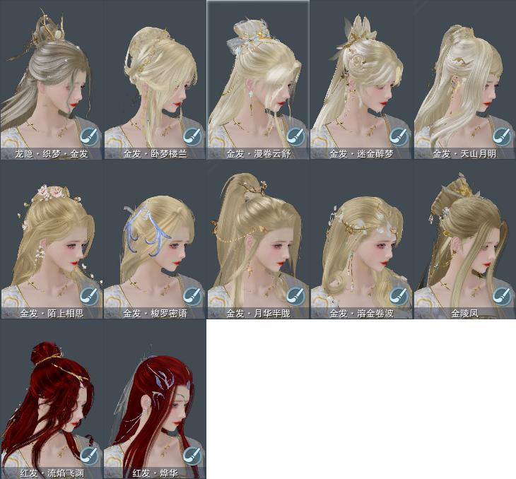 【发型】金发10个[一代金, 资历金, 鸡金, 蝶金, 考金, 丝路金, 牛金, 云金, 女仆金, 白龙隐金发], 红发3个[七红, 九红, 小资历红], 黑发15个, 白发10个, 盒子发型[丝路黑, 二代七夕白, 踏云黑发, 四代中秋粉黑发, 紫盒黑发, 雪月白发, 白楼兰黑发, 丝路白, 四代中秋粉白发, 白楼兰白发, 墨心白发, 白六七黑发, 幽涧愀兮白发, 灵龙盒黑发, 灵龙白发, 婚纱盒黑发, 龙吟盒黑发, 龙吟盒白发], 总页数4