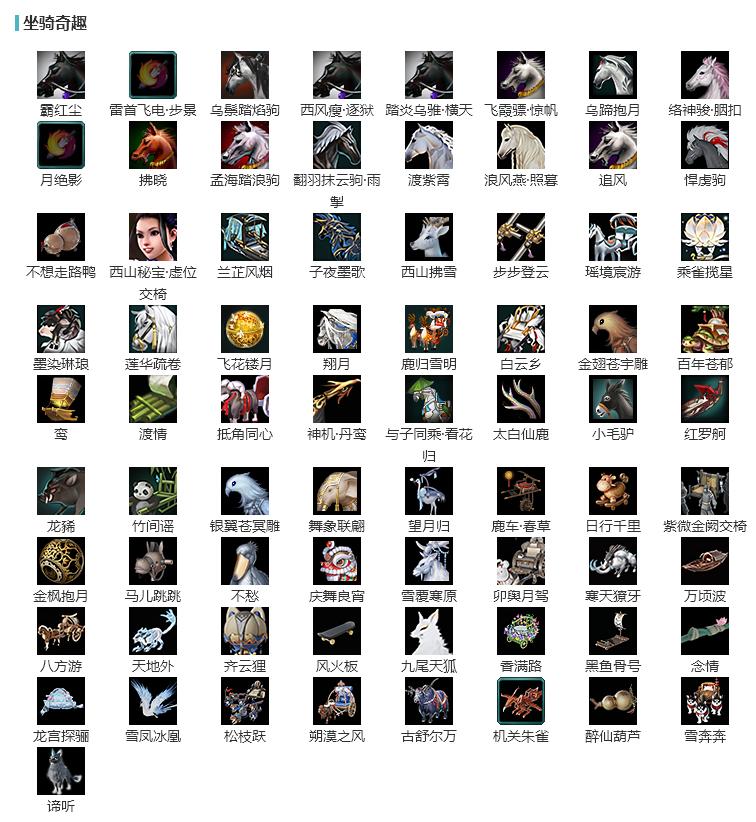 【坐骑】9个[踏炎横天, 西风瘦逐狱, 飞霞骠惊帆, 乌蹄抱月, 翻羽抹云驹雨掣, 络神骏胭扣, 霸红尘, 雷首飞电步景, 乌鬃踏焰驹]