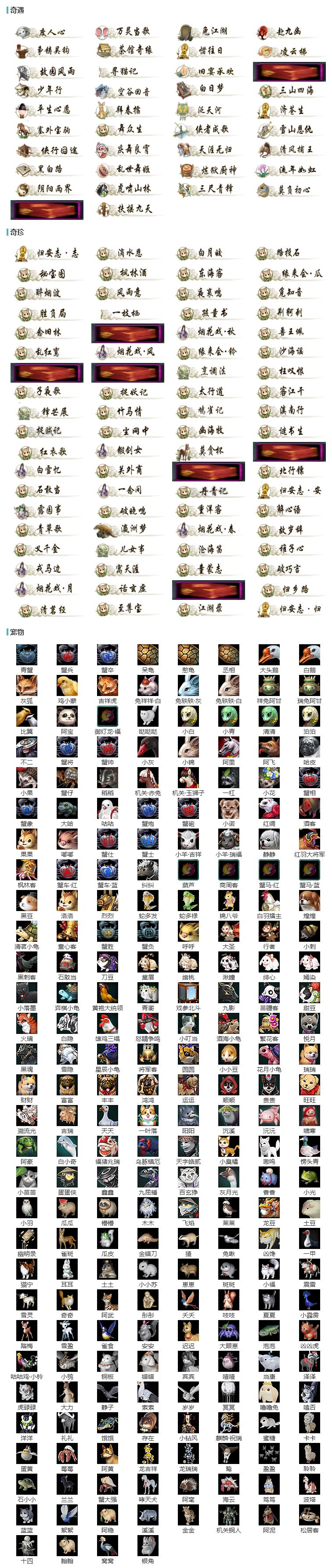 【奇遇】37个[三山四海, 天涯无归, 白日梦, 阴阳两界, 雪山恩仇, 兔江湖, 黑白路, 平生心愿, 莫负初心, 塞外宝驹, 惜往日, 乱世舞姬, 争铸吴钩, 虎啸山林, 济苍生, 少年行, 三尺青锋, 扶摇九天, 故园风雨, 流年如虹, 清风捕王, 舞众生, 侠行囧途, 茶馆奇缘, 寻猫记, 万灵当歌, 庆舞良宵, 炼狱厨神, 凌云梯, 度人心]