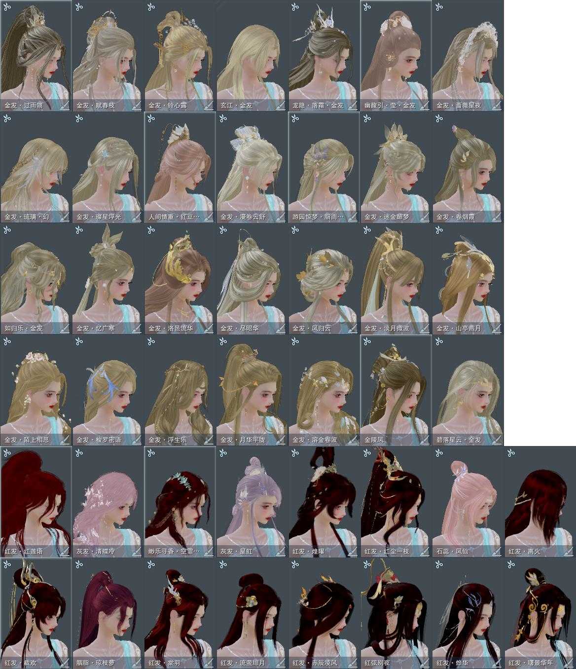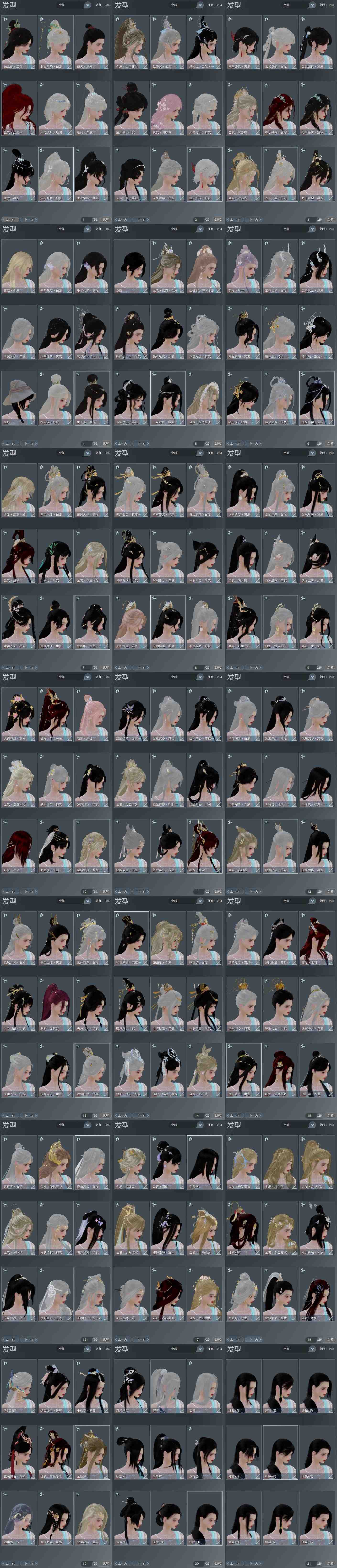 【发型】金发29个[一代金, 兔金, 资历金, 鼠金, 中秋金, 鸡金, 蝶金, 喵金, 考金, 国金, 苏金, 倒闭金, 狗金, 玫瑰金, 如归金, 角金, 牛金, 云金, 雪金, 海金, 蔷薇金, 铃金, 玄江金发, 蛇金, 翎金, 紫游园金发, 红人间金发, 白幽馥金发, 蓝龙隐金发], 红发16个[七红, 八红, 十红, 十二红, 紫发, 凤仙粉, 蝶粉, 猴红, 鸡红, 牛红, 兔红, 小资历红, 大资历红, 绿寻香红发, 十六红, 二代灰], 黑发80个, 白发52个, 盒子发型[一代蓝中秋白, 一代七夕白, 二代七夕白, 踏云黑发, 四代七夕黑发, 一代花朝绿白, 四代中秋蓝黑发, 狗白, 蓝谪仙黑发, 二代重阳白, 三代中秋白, 晴岚绘黑发, 山吹樱雪黑发, 黑楼兰黑发, 踏云白发, 澡盒黑发, 四代七夕白发, 飞皇黑发, 四代中秋蓝白发, 二代乘风黑发, 五代七夕黑发, 蓝谪仙白发, 晴岚绘白发, 山吹樱雪白发, 黑楼兰白发, 浮岚黑发, 澡盒白发, 飞皇白发, 二代乘风白发, 入梦黑发, 五代七夕白发, 浮岚白发, 沧海黑发, 唐风玉壶黑发, 黑红尘黑发, 紫游园黑发, 流萤白发, 紫幽香黑发, 沧海白发, 唐风玉壶白发, 黑红尘白发, 白明光黑发, 小熊黑发, 紫幽香白发, 十二黑, 芙蓉黑发, 六代中秋黑发, 小熊白发, 六代中秋白发, 花滑黑发, 星源黑发, 红人间黑发, 花滑白发, 星源白发, 七七黑发, 七中黄盒黑发, 竹露响霜色黑发, 金幽昙黑发, 七七白发, 七中黄盒白发, 幽涧愀兮白发, 除夕盒黑发, NPC黑发, 蓝钻石盒黑发, 红椿山黑发, 蓝椿山黑发, 除夕盒白发, 蓝钻石盒白发, 灵龙盒黑发, 红椿山白发, 蓝沧洲盒黑发, 灵龙白发, 八七盒黑发, 黑幽馥黑发, 八七盒白发, 粉鹭黑发, 梦盒黑发, 九七黑发, 梦盒白发, 九七白发, 绿寻香黑发, 仙剑黑发, 瓷盒黑发, 蓝洛神黑发, 傀儡黑发, 仙剑白发, 瓷盒白发, 千手黑发, 蓝洛神白发, 傀儡白发, 白战国黑发, 千手白发, 蓝沙丘白发, 十七白发], 总页数21