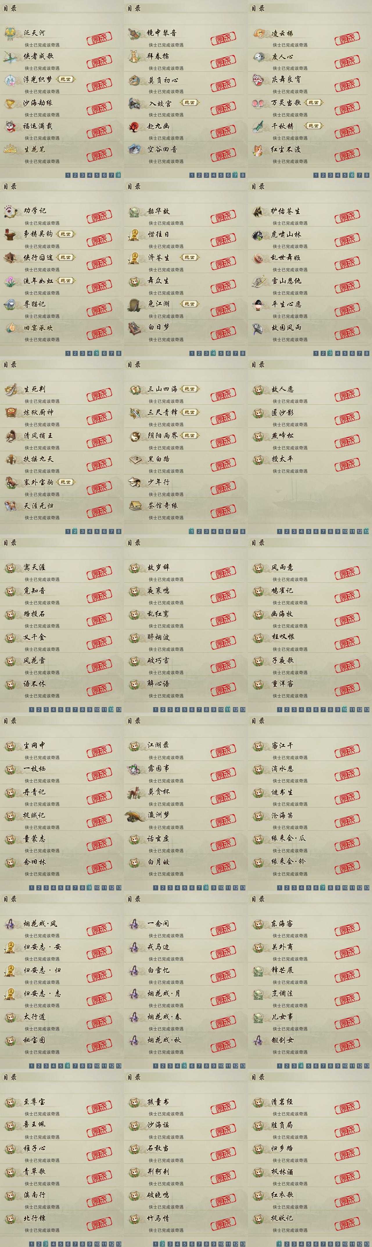 【奇遇】48个[白日梦, 天涯无归, 三山四海, 劝学记, 雪山恩仇, 阴阳两界, 莫负初心, 兔江湖, 平生心愿, 黑白路, 惜往日, 乱世舞姬, 塞外宝驹, 争铸吴钩, 韶华故, 虎啸山林, 济苍生, 护佑苍生, 少年行, 故园风雨, 扶摇九天, 三尺青锋, 流年如虹, 舞众生, 清风捕王, 侠行囧途, 寻猫记, 茶馆奇缘, 入蛟宫, 庆舞良宵]
