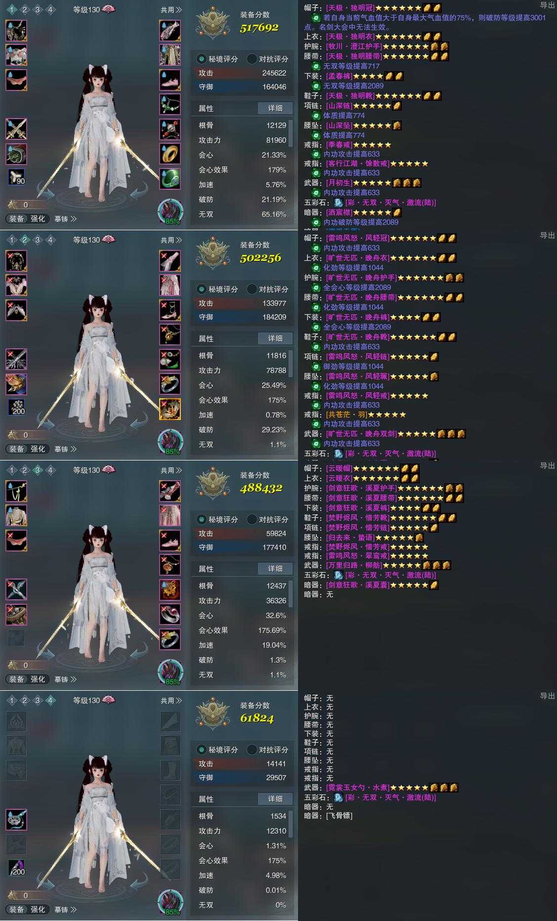 【装备】130级,冰心诀PVE517692,冰心诀PVP502256,云裳心经PVP488432,装备四61824