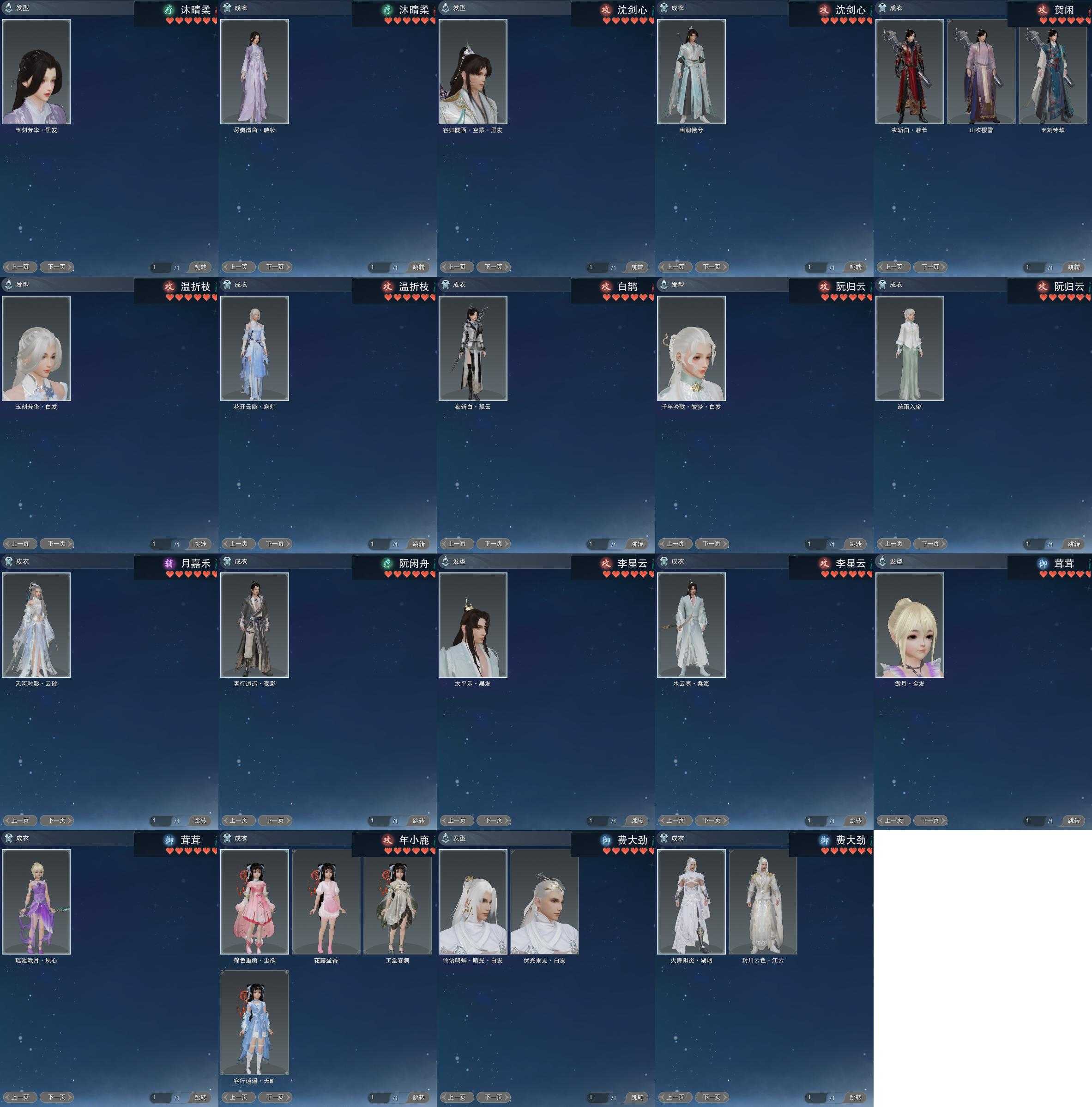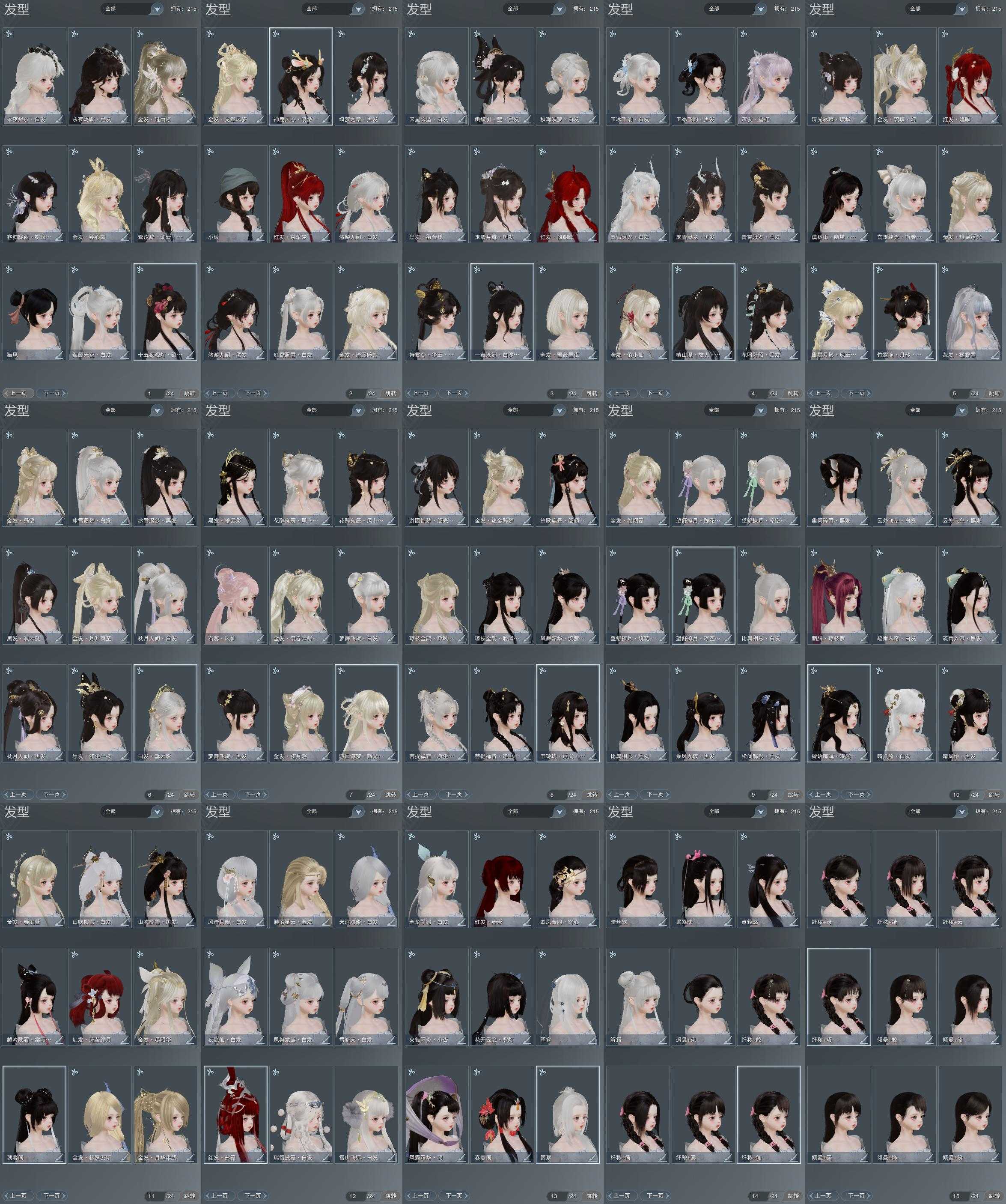 【发型】金发23个[资历金, 鼠金, 中秋金, 鸡金, 苏金, 角金, 牛金, 巴卡金, 云金, 香蕉金, 虎金, 雪金, 海金, 刺金, 蔷薇金, 水母金, 龙金, 铃金, 傲月金发, 翎金, 白琼枝金发, 新白游园金, 白幽昙金发], 红发10个[五红, 十四红, 紫发, 凤仙粉, 羊红, 兔红, 小资历红, 龙红, 二代灰, 一代灰], 黑发59个, 白发37个, 盒子发型[四代中秋粉黑发, 晴岚绘黑发, 山吹樱雪黑发, 白楼兰黑发, 澡盒黑发, 飞皇黑发, 幽阑黑发, 同人黑发, 二代乘风黑发, 五代七夕黑发, 绿中秋黑发, 紫中秋黑发, 晴岚绘白发, 山吹樱雪白发, 白楼兰白发, 浮岚黑发, 净尘黑发, 澡盒白发, 飞皇白发, 五代七夕白发, 绿中秋白发, 流萤黑发, 紫中秋白发, 白琼枝黑发, 净尘白发, 唐风韶颜黑发, 新白游园黑, 小熊黑发, 红六七黑发, 十二黑, 二胡黑发, 小熊白发, 红六七白发, 二胡白发, 花滑黑发, 花滑白发, 竹露响丹砂黑发, 黑傣族黑发, 蓝钻石盒黑发, 白雪人白发, 黑椿山黑发, 踏青黑发, 青霄盒黑发, 灵龙盒黑发, 蓝兔盒黑发, 紫沧洲盒黑发, 白持君盒黑发, 灵龙白发, 蓝兔盒白发, 八七盒黑发, 白幽馥黑发, 六代重阳白发, 游龙盒黑发, 婚纱盒黑发, 天星盒白发, 粉鹿黑发, 紫观灯盒黑发, 红香盒白发, 游龙盒白发, 粉鹭黑发, 海阔盒白发, 白蛇盒白发, 彩陇西黑发, 紫陇西黑发, 傀儡黑发, 傀儡白发], 总页数15