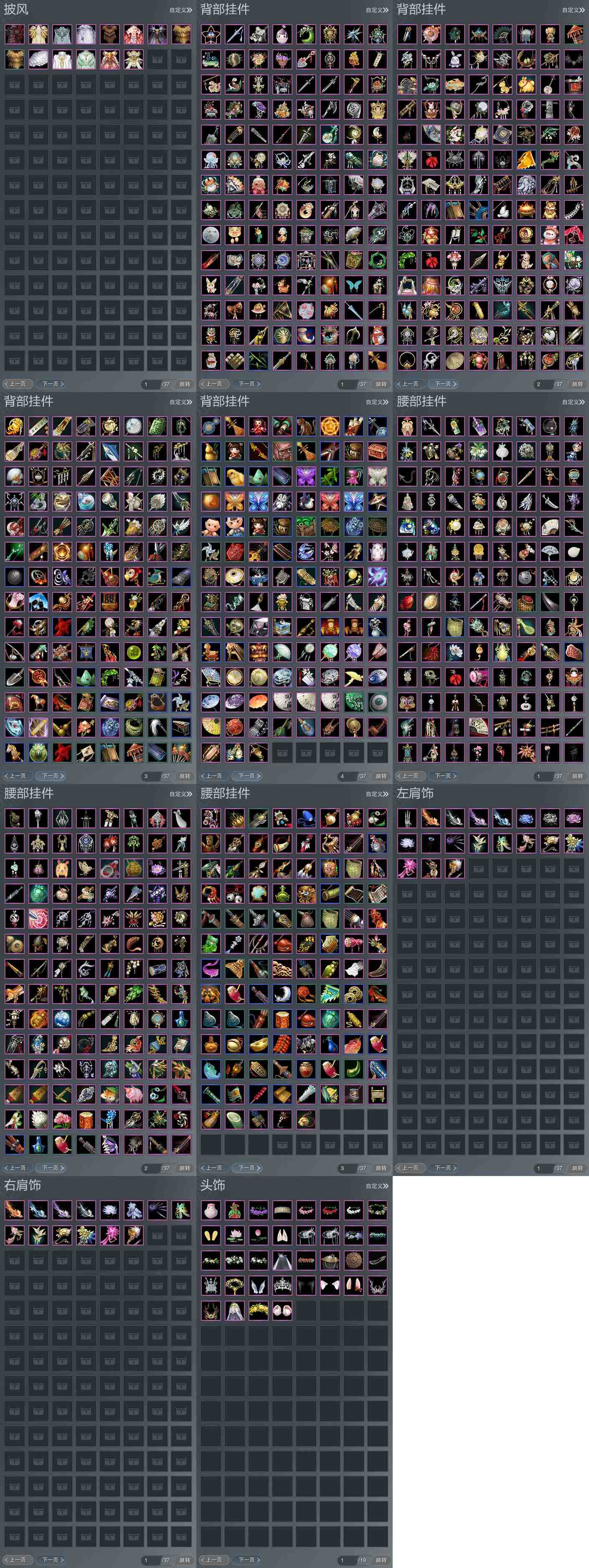 【肩饰】19左,14右,[双鱼曳波·慧福·左, 双鱼曳波·无量·左, 双鱼曳波·如意·左, 双鱼曳波·极乐·左, 绝代仙·玉璃·左, 绝代仙·墨楼·左, 绝代仙·神姿·左, 绝代仙·千幻·左, 海升霞蔚·霁景·左, 漱玉寒·紫殿·左, 青池泠月·左, 云岚叠岫·左][绝代仙·千幻·右, 漱玉寒·紫殿·右, 青池泠月·右, 云岚叠岫·右]