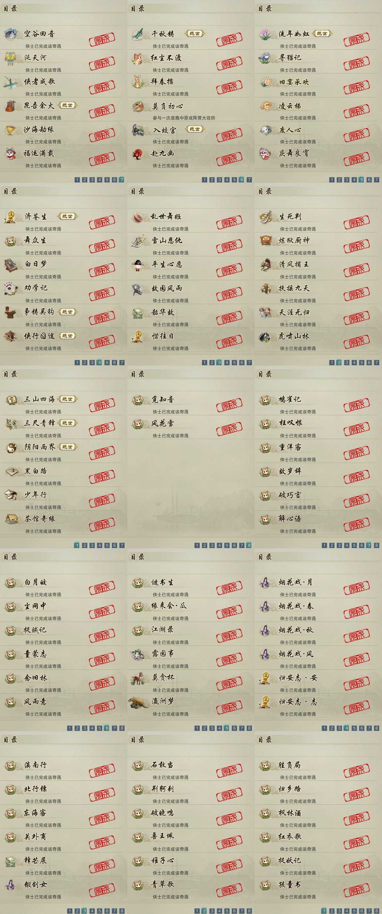 【奇遇】42个[白日梦, 天涯无归, 三山四海, 劝学记, 雪山恩仇, 阴阳两界, 莫负初心, 平生心愿, 黑白路, 乱世舞姬, 惜往日, 争铸吴钩, 韶华故, 虎啸山林, 济苍生, 少年行, 故园风雨, 扶摇九天, 三尺青锋, 流年如虹, 舞众生, 清风捕王, 寻猫记, 侠行囧途, 茶馆奇缘, 入蛟宫, 庆舞良宵, 生死判, 千秋铸, 凌云梯]