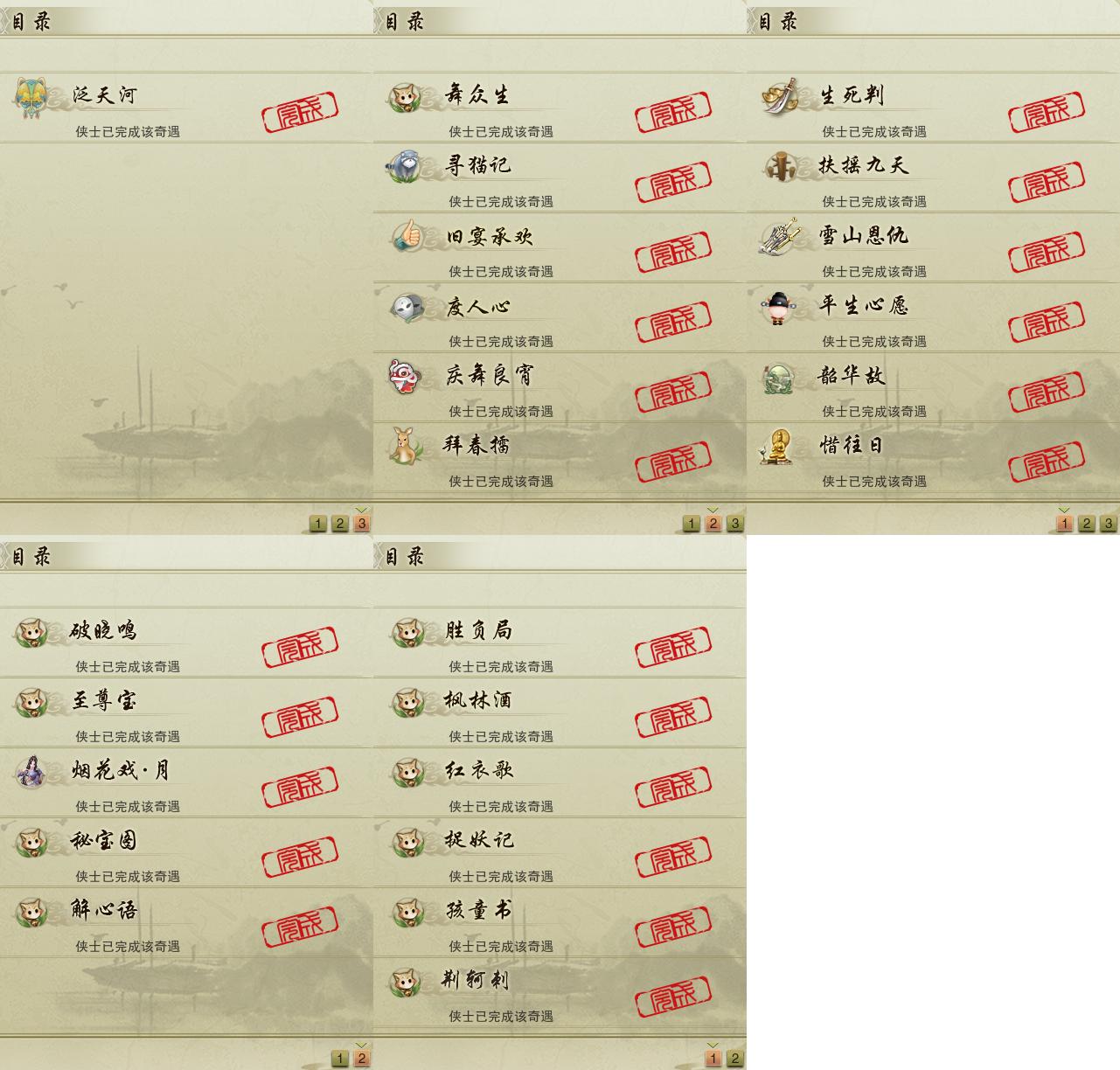 【奇遇】13个[雪山恩仇, 平生心愿, 惜往日, 韶华故, 扶摇九天, 舞众生, 寻猫记, 庆舞良宵, 生死判, 度人心, 旧宴承欢, 泛天河, 拜春擂]