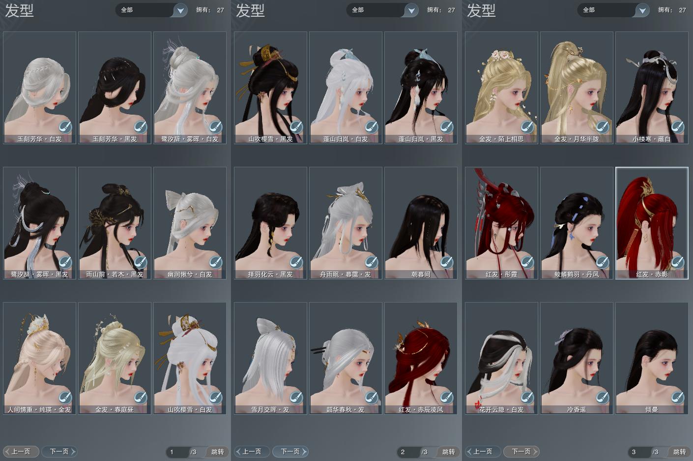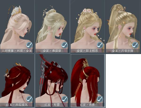 【发型】金发4个[鼠金, 鸡金, 考金, 紫人间金发], 红发3个[五红, 八红, 羊红], 黑发10个, 白发9个, 盒子发型[二代花朝黑, 二代七夕白, 一代花朝白白, 雪月白发, 山吹樱雪黑发, 二代花朝白, 山吹樱雪白发, 紫雨山前黑发, 幽涧愀兮白发, 白鹭黑发, 白鹭白发], 总页数3