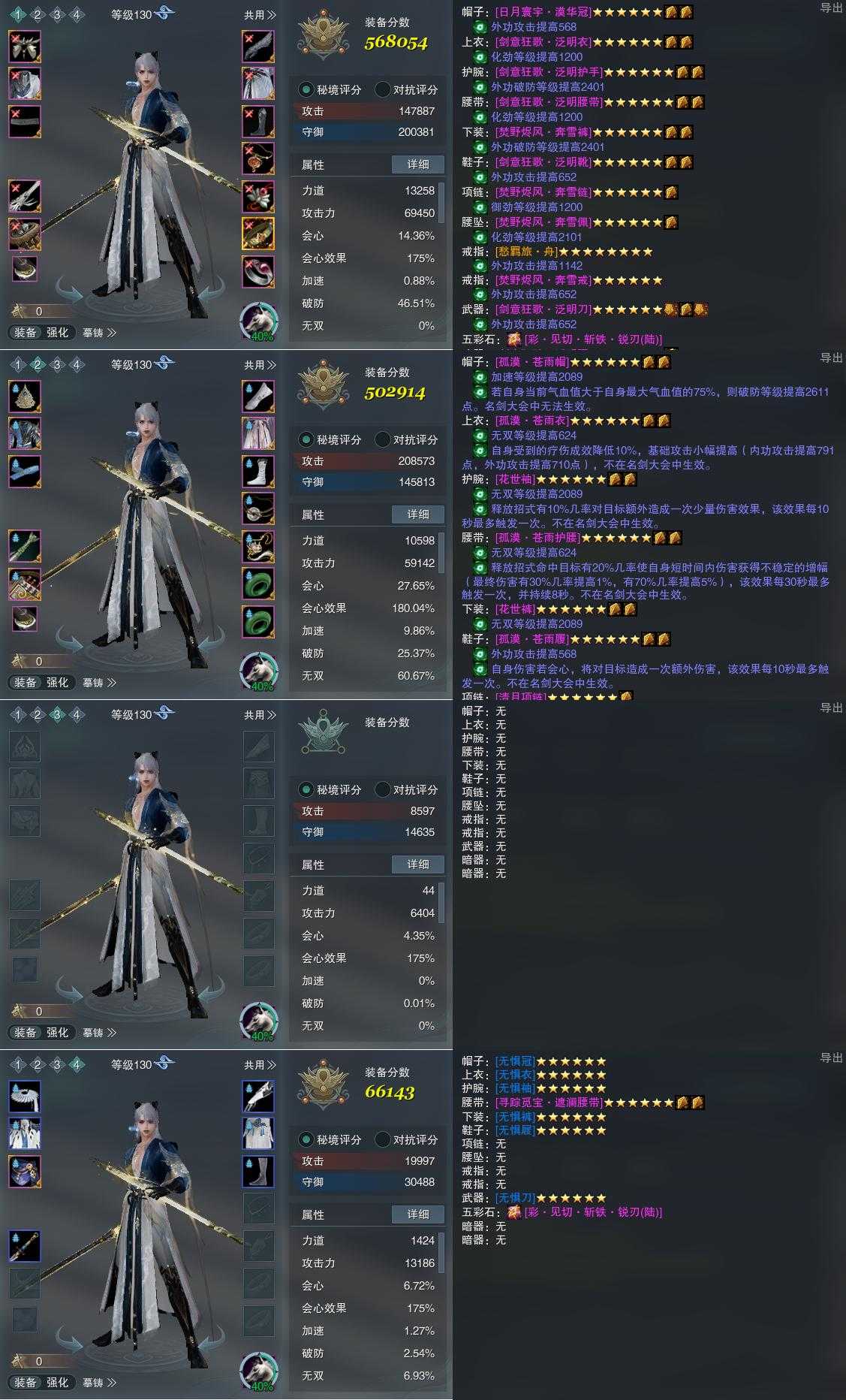 【装备】130级,孤锋诀PVP568054,孤锋诀PVE502914,装备三0,装备四66143