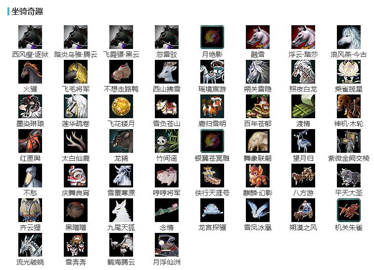 【坐骑】5个[踏炎腾云, 西风瘦逐狱, 飞毛将军, 飞霞骠黑云, 浪风燕今古]