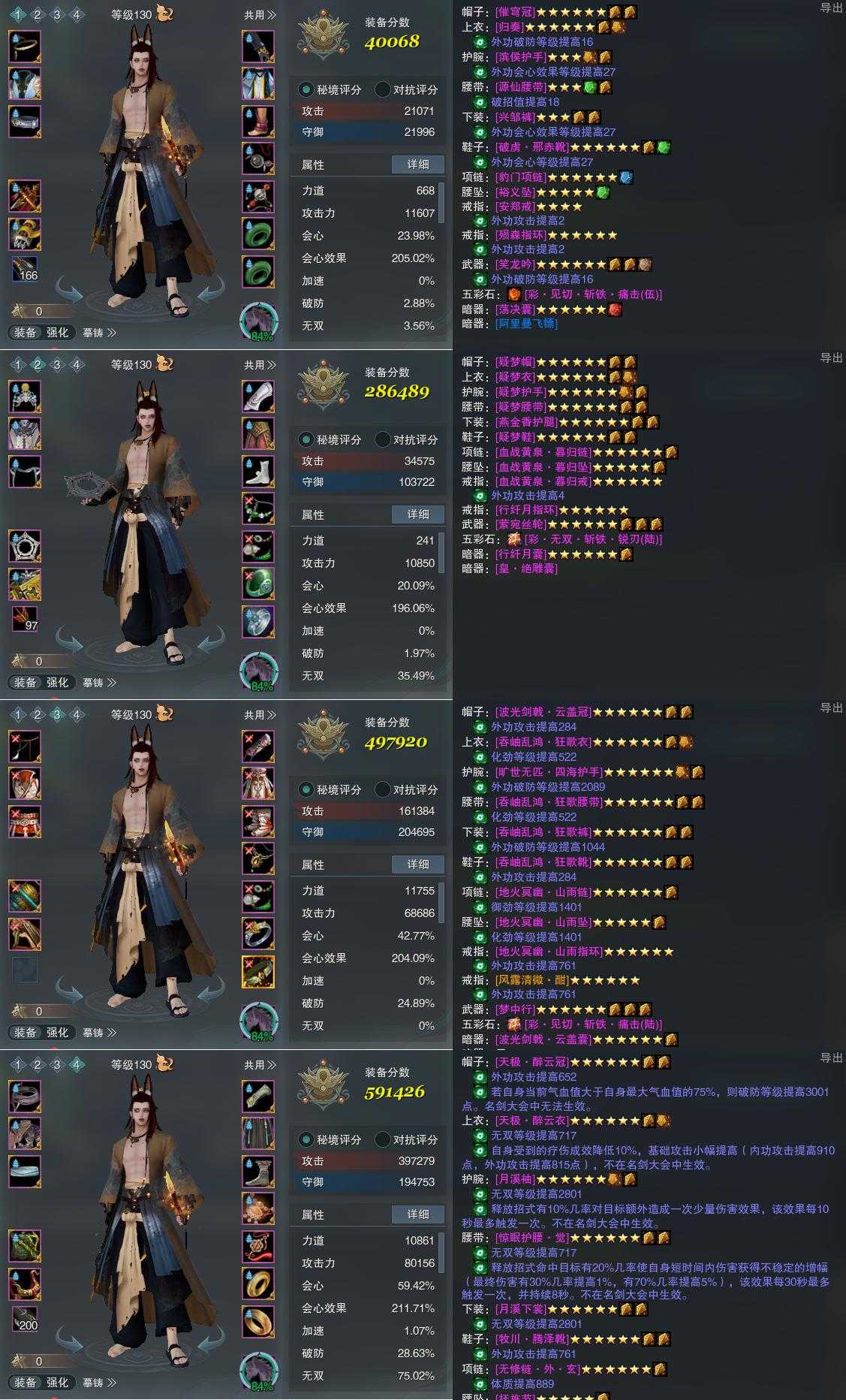 【装备】130级,装备一40068,装备二286489,笑尘诀PVP497920,笑尘诀PVE591426